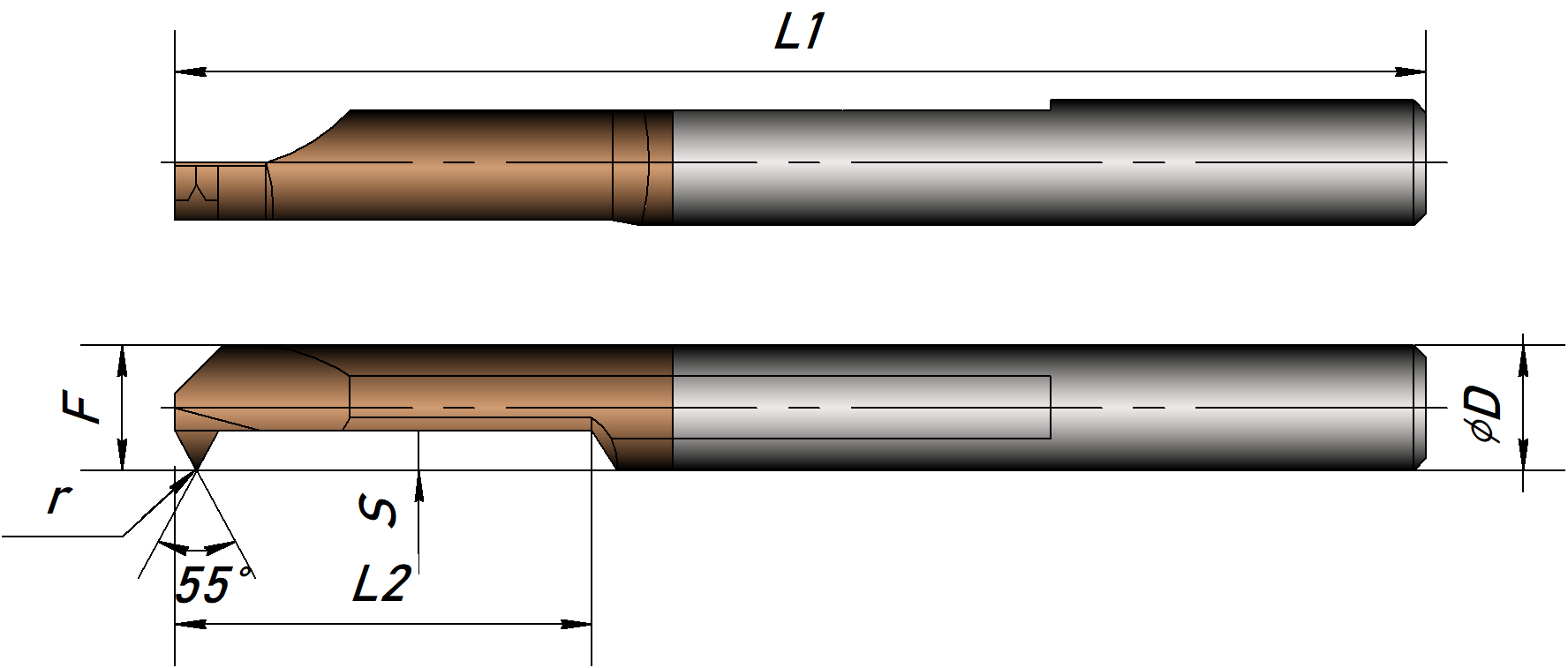 Твердосплавный монолитный резец для обработки дюймовой резьбы 55°. Прямая режущая кромка для увеличения прочности. Профиль - неполный. Для обработки диапазонов шагов.